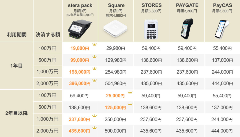 JCB系のカード、QR、電マネーの手数料はほぼ変わりません。なので、カード決済手数料(visa/master) +初期費用+月額費用の計算です。契約年数と決済額によって費用は異なり、最安のstera packは他社と比べて年間3〜4万円ほど安くなります。