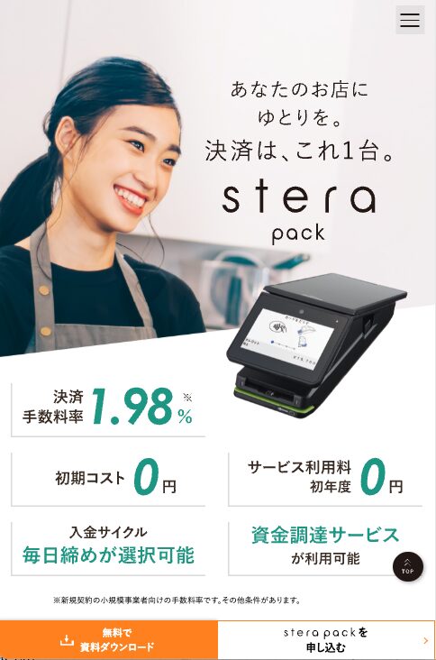 | SteraPack (月額0円※2年目3,300円) ![]() 公式サイト | 1.98% | 2.48% | 3.24% | オールインワン端末で、必要な全て機能が揃う |