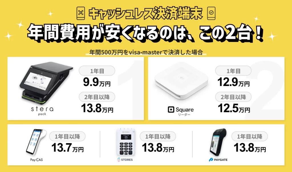 【決済手数料】キャッシュレス決済端末の費用を解説!最安はstera packとSquare!